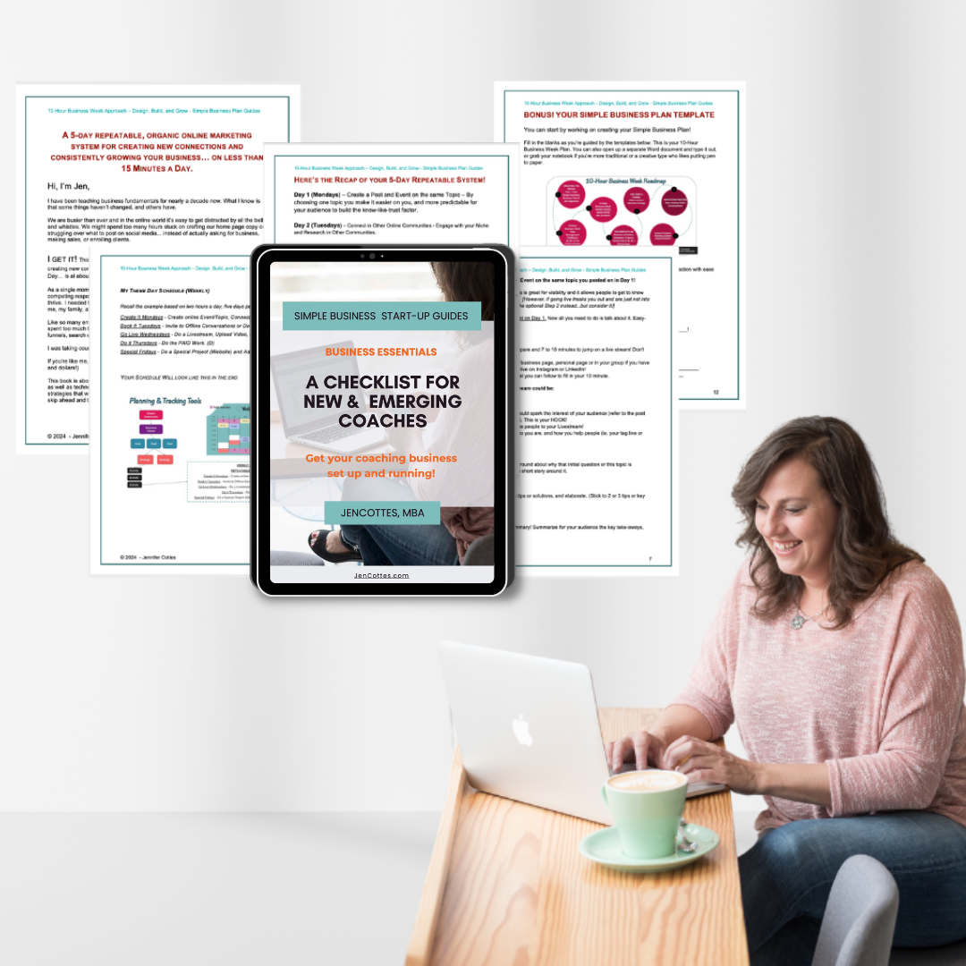 The Business Essentials Checklist for New & Emerging Coaches and get your 10-Hour Business Week Planning Template.